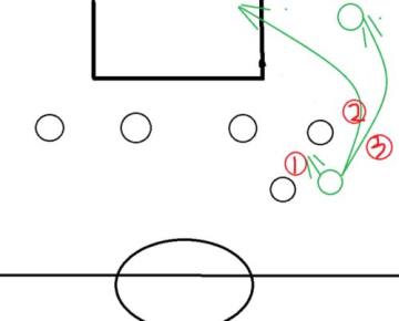 紫色队员一般是边后卫或者后腰,这时当他们拿球时,要往中路跑(圆圈1),此时有两种选择,1直塞给边路的队友,2给一个挑球。当队友拿到球后就到下一步