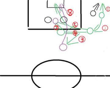 假如你能推到大概这个位置,那还比较好,这时自己的边后卫一般都会上来支援(圆圈1),那么往后向身后传球(圆圈2),边后卫拿到球后这时有两个选择,如果刚刚的队友往禁区方向跑位的话(圆圈3),把球塞给他(圆圈4),然后就重复了刚刚边路过人的步骤。第二种选择就是高球传中(圆圈5)。如果是头球比较好有比较高的球员,像是伊布,C罗这些的话,球比较容易进,但传中比较讲究力度与方向,如果传的不好很容易被对方门将没收。这里我比较建议传到后门柱附近,因为这里可以算是一个死角,门将没反应过来,你就把球顶进了。