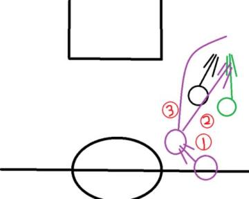 首先向左稍微一推(圆圈1)(其实就是向左走),这时对方的防守球员就会跟着你走,此时你再往右一拉,如果你的球员灵敏度高,那么在对方向右走想断你球的时候,你已经把球拉到右边了。在拉的同时你就按加速,你就达成了一个过人,但是这样还不行,因为对方球员会回防,但是就有两个选择了