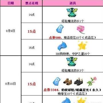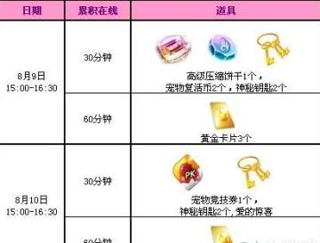 8月9日至8月10日每天15点至16点30分期间,累积在线30分钟、60分钟,即可轻松获得宠物用品、神秘钥匙、黄金卡片等热门道具。