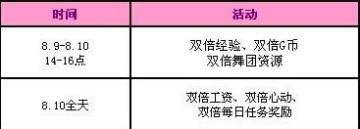8.9-8.10每天14-16点将开启双倍经验、双倍G币双倍舞团资源活动。8.10全天全天将开启双倍工资、双倍心动、双倍每日任务奖励活动。