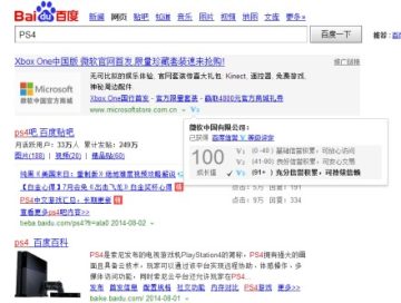 微软XBOX ONE主机进入中国为拓展市场可能已经展开了攻势,最明显简单的感受方式就是在百度搜索PS4,检索结果页面顶部一定会出现XBOX ONE的推广信息。看起来这应该已经是百度竞价排名/广告最高规格的营销推广服务,当然这也说明PS4与XBOX ONE彼此之间的竞争关系,看来微软给百度塞钱了。