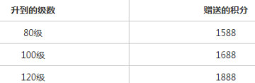 活动内容:活动期间,将任意角色或坐骑升级到以下指定级数,即可获赠相应的积分大返利。积分返利是可以叠加的哦,比如将角色或坐骑从60级升级到120级,总共可以获得1588+1688+1888=5164的积分!多升多送,不限角色/坐骑数量!