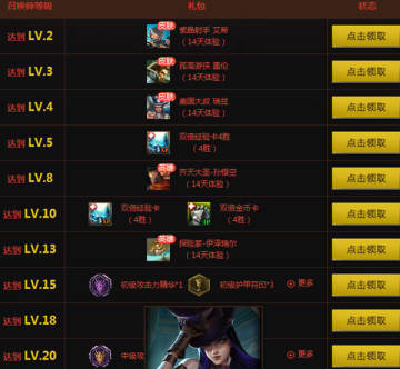 玩家角色达到对应等级时,可来此页面领取对应奖励,请在角色达到21级前领取。