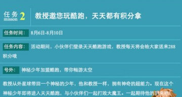在天天酷跑游戏中,8月6日-8月10日的任务中,有消息称神秘少年将加盟酷跑,带你畅游太空,下面给大家带来已知的神秘少年的信息。