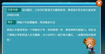 教授从外星球待会一个神秘的少年,他和教授一样,拥有神奇的超能力。现在这个神秘少年即将进入天天酷跑,与小伙伴们一起打败大魔王。一起期待他的到来吧!