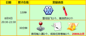 8月9日,20:30-22:30累积在线1分钟和30分钟即可领取20806点券+珍品道具。