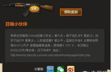 1.登陆活动页面,微博分享或者微信转发成功,可获得AK47(3天)。