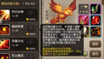 【超级新星】凤凰非常强大的一个技能,也是敢于卖血的基础,当血量为0时会化作蛋蛋,5秒后信春哥复活。复活后的生命值和技能相挂钩,技能每提升1级,就增加150的生命值,80级就是12000,90级就是13500,和骷髅王的紫色技能一样。