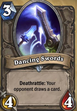 舞动之剑4费消耗,4/4的身材,负面效果你的对手抽一张牌,最早放出来的冒险模式的一批卡之一,最开始还以为是武器卡。