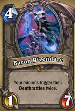 瑞文戴尔男爵,4费1/7,特效,你的所有随从获得2次亡语效果。
