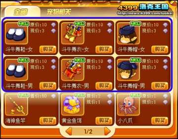 2、可以看到,要先去商城购买整套的”斗牛舞服“,再来参加游戏才有可能得到这只宠物哦!
