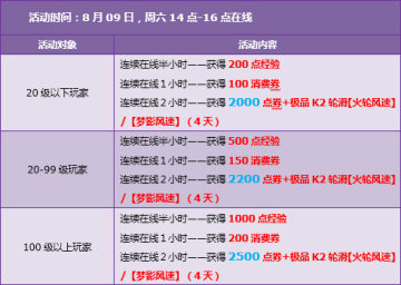 QQ飞车玩家在8月9日周六下午2点-4点连续在线2个小时就可获得极品K2轮滑火轮风速和梦影风速。