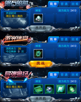 此次新版本在玩法上最大的变动无疑是新增加的活动关卡了。点击闯关模式我们可以看到界面下方增加了活动关卡的入口,此次新增加了三个活动关卡,分别为陨石陷阱、激光迷宫、导弹猎场。每个关卡都分为简单、普通以及困难三个难度,体力消耗也根据难度分别为20、40和60体力,只有导弹猎场的三个难度均消耗20体力。玩家可以在这里获得大量物资,为战机的升级进化提供最有力的保障。好东西当然不是每天都有的,三个关卡是轮流开放的。每周一、周四、周日开放陨石陷阱,产出矿物类物品,用于卖出获得金币;每周二、周五、周日开放激光迷宫,产出强化魔方类物品,用于装备升级提供经验;每周三、周六、周日开放导弹猎场,产出进阶材料,用于装备进阶。所以小伙伴们一定要按需索求了。
