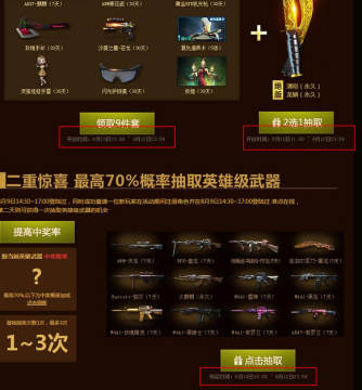 青刚龙鳞是这次活动推出的一个比较好的奖励,很多玩家对于黄金小刀很眼馋了哦,只要在8.9日准点在线的玩家就可以在8月10日进入活动页面抽取青刚、龙鳞其中的一把了,二选一几率很打了!