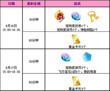 累计在线30分钟:宠物竞技券1个,宠物复活币3个,神秘钥匙2个。