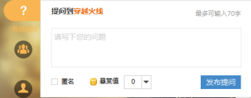 点击“我要提问”,会打开提问到“地下城与勇士”的窗体,在问题输入框内填写少于70个汉字的问题。并且可选择是否匿名发问,或是给问题设置悬赏值。