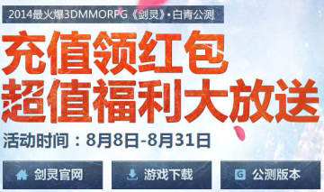 《剑灵》充值领红包超值福利大放送活动现已开启,在2014年8月8日至31日活动期间,玩家通过官方渠道充值剑灵点券,可获得充值积分,消耗等值充值积分可领取相应红包,积分红包可根据充值积分额度多次领取。这里给大家分享下《剑灵》充值领红包超值福利大放送活动介绍,以及活动网址一览。