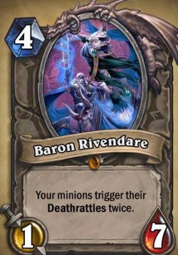 这是一张需要配合的牌,一般来说,配合的牌都容易卡手。但所有亡语随从都可以配合此卡一起,使他在亡语卡组中不太容易卡手。因此,瑞文戴尔男爵是亡语卡组的非常重要的一张核心卡。