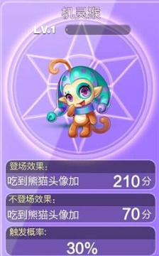 《天天酷跑》机灵猴怎么得 机灵猴属性技能介绍 来源: 飞翔小编 2014/8/14 10:46:11 浏览量:523 《天天酷跑》在今天推出了大量新精灵,其中就包括机灵猴,这里给大家分享下《天天酷跑》机灵猴怎么得,机灵猴属性技能介绍。机灵猴怎么得?1.精灵商店话费128钻石购买,有几率得到。2.积分抽取,一定几率得到。机灵猴属性技能介绍:登场效果:吃到熊猫头像加210分不登场效果:吃到熊猫头像加70分触发概率:30%