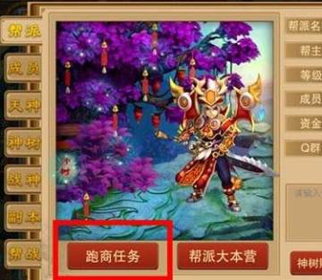 跑商任务是帮派家族的新福利之一,因此玩家需要先加入帮派, 并且跟着大家齐心协力每天做完帮派任务,一起将帮派升至2级以上,通过与帮派使者对话,进入大本营,也可通过点击“玩法”——“帮派”——“帮派大本营”进入。