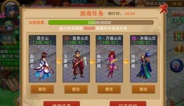 每个玩家任务一开始都有20000银票,通过在几个商人中进行货物买卖赚取到45000银票既可完成任务,获得帮贡和银子,并且每天能接受的人物次数是无限次的哦!等等,你灵机一动,如果用飞鞋去跑商那不是无限刷钱!?好吧,你很聪明,但游戏中限制了不能用飞鞋。
