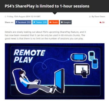 索尼PS4新功能SharePlay游戏分享详细介绍 来源: 飞翔小编 2014/8/16 23:43:17 浏览量:372 索尼PS4主机即将推出的系统升级中将会加入新的功能SharePlay游戏分享,关于该功能的细节已经慢慢清晰。目前已知“SharePlay”每次连接时间被限制在60分钟,但好消息是连接的次数没有上线!这咋看起来并不是很大的问题,但当你与好友分享《FIFA》《战地》这种强调多人对局的游戏时,中场断线绝对是非常扫兴。