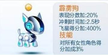霹雳狗的技能则是对女性角色加成3%。表现分数加成20%、冲刺时间加2.5秒以及飞星得分加成400%的属性值也很强悍!