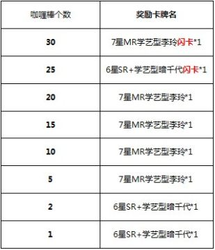每次11连扭蛋都将获得1个“咖喱棒”(以道具形式发放至游戏内礼盒),集齐不同个数可获得特定奖励,最高奖励7星MR学艺型李玲闪卡(每项奖励只可获得1次,不循环)!