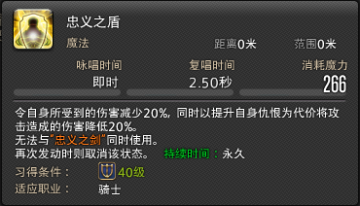 40级才学会的状态,是骑士坦克的标志,集减少伤害与提升仇恨与一身,开怪前请检查是否开启。