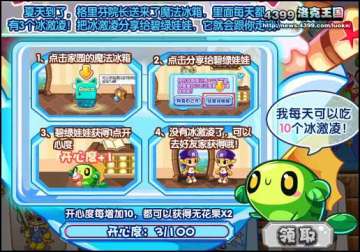 家园里的魔法冰箱给碧绿娃娃吃,碧绿娃娃可获得1点开心度。每天最多能吃10个冰淇凌。