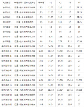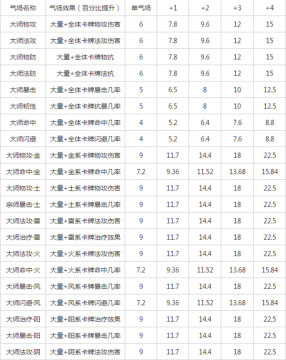 《欢乐西游》气场叠加效果一览 来源: 飞翔小编 2014/8/26 10:41:11 浏览量:495 在欢乐西游游戏中,气场效果的强弱并不仅仅取决于气场品质,气场的叠加效果也是至关重要的,这里给大家分享下游戏中所有的气场叠加效果。举例来说,同一类型的气场宗师+1的效果小于大师+3的效果。卡牌阵型中,与队长气场相同的队员气场可以叠加,最多叠加4次。游戏中主要用到的气场均为大师级和宗师级,具体气场加成数据详见下表气场叠加效果一览表【宗师级】 【大师级】