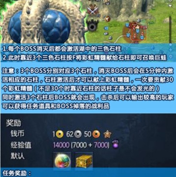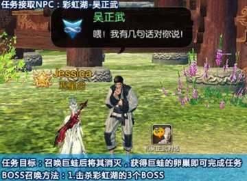 《剑灵》彩虹湖呱噪的青蛙任务攻略 来源: 飞翔小编 2014/8/26 15:10:18 浏览量:786 在剑灵游戏中,玩家可以在彩虹湖NPC吴正武处接取呱噪的青蛙任务(巨蛙神任务),很多玩家不知道这个任务怎么做,这里给大家详细介绍下这个任务的流程。