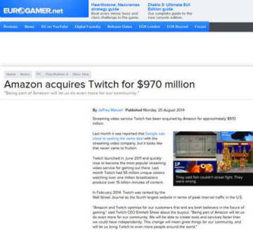 亚马逊宣布9.7亿美元收购游戏视频直播网站Twitch 来源: 飞翔小编feichenpan 2014/8/26 21:24:17 浏览量:432 根据国外游戏媒体eurogamer最新情报显示,亚马逊正式宣布收购游戏视频直播网站Twitch,其交易金额为9.7亿美元现金。从亚马逊先前发售游戏盒子的动作来看,现今收购Twitch是准备正式进军游戏业。Twitch在2011年6月上线推出,专注游戏直播领域,之前传闻Google正在收购,最后结果却是亚马逊达成了交易。