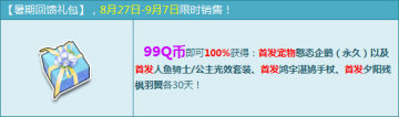 8月27日-9月7日,只需要在商城购买“暑期回馈礼包”,开启就100%获得首发宠物憨态企鹅及首发人鱼骑士/公主光效套装(30天)、首发鸿宇湛鸠手杖(30天)、首发夕阳残枫羽翼(30天),现在得到这些只需要99Q币!