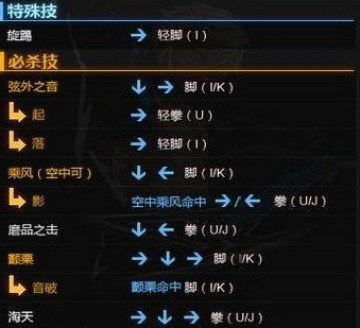 旋踢:向前小跳跃起的踢击,单发时蹲防不能,可衔接在普通攻击和空中必杀技之间