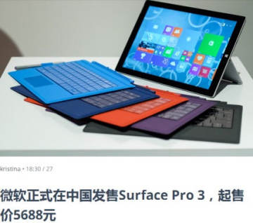 微软宣布将于2014年8月28日起在中国发售Surface Pro 3平板电脑及配件,其起售价5688元,其屏幕为12英寸和分辨率为2160x1440,并提供多种英特尔酷睿处理器的版本可供选择。Surface Pro 3专业版搭载了Windows 8.1 Pro,用户可以运行习惯使用的传统桌面应用,同时也可以通过分屏窗口完成多任务处理。