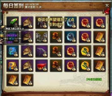 2.右上角有个签到一定要记得签!签到会给对应的奖励!第一天签到小编得到了神品飞速之羽、小瓶鱼肝油以及小灵丹。