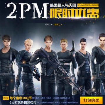 CF穿越火线新版本迎来了韩国人气偶像天团2PM共计六名新角色,并且同时开启2PM限时优惠活动6人打包只需要30Q币,购买之后可以领取酷炫套装、海盗套装、搞怪套装和卖萌套装,同时还获得一次抽奖机会,这里给大家分享下CF穿越火线2PM限时优惠活动介绍。