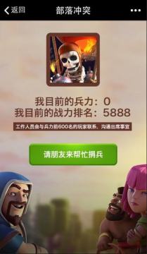 如何才能获得“部落冲突玩家盛典”珍贵的限量门票呢?这就需要你微信上小伙伴们的帮忙啦,参与活动后转发到朋友圈就可以让小伙伴们帮你捐兵增加兵力值,最终,兵力值排名前600的玩家会得到门票。友情提示:虽然你的小伙伴们已经被各种求转发求投票求点赞的信息骚扰得不行不行的,但是——你可以告诉他们这次不一样,“部落冲突玩家盛典”百年一遇,全国只发放600张门票,用真诚和耐心去打动他们吧!