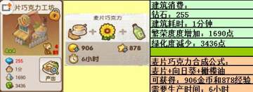 玩家在建造麦片巧克力工坊之后就可以生产麦片巧克力了。但是想要生产麦片巧克力必须要有麦片、向日葵和橄榄油这三种原料。另外麦片巧克力的生产时间为6个小时,玩家可以获得906金币和878经验。
