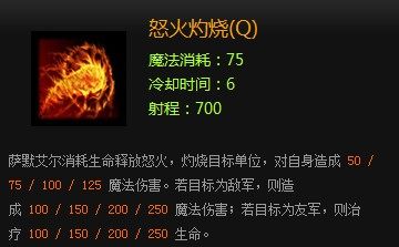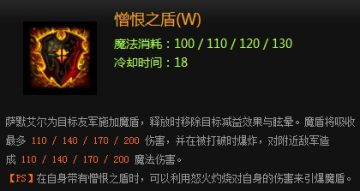 说明:作为一个防护型技能而且满级后此技能CD只有9秒.对友方及自己施放时可以瞬间移除自身的负面BUFF.满级盾可以吸收200伤害配合Q怒火灼烧技能使用不仅不掉血还能让盾爆炸。