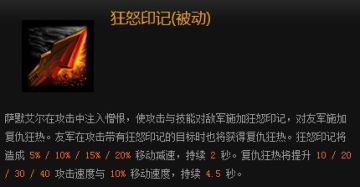 说明:被动BUFF型技能,配合队友一起完全增强团队的输出能力,并且也因为此技能让暴怒拥有当输出型坦克的能力。