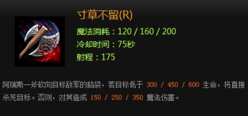 说明:低魔耗,短CD,远攻击.不管杀人还是救人都能在及远的距离安全使用。(PS认为自己快要被敌方击杀时而又刚好没血时用来自杀用.)