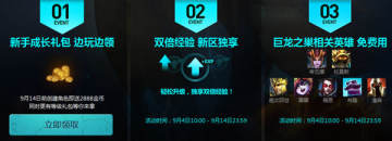 1.新进巨龙之巢大区的召唤师家能够获得新手成长礼包,在升级的过程中不断领取游戏提供的各类福利,而于9月14日前创建角色就可以得到2888金币。