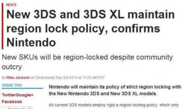任天堂新3DS掌机依然严格保持锁区政策不变 来源: 飞翔小编 2014/9/4 21:01:46 浏览量:333 之前外媒传闻任天堂新3DS掌机将不锁区,不过根据北美任天堂官方本周三透露给Gamespot的情报显示,确认New 3DS与New 3DS XL依然严格保持锁区政策不变。众所周知,任天堂长期在WiiU和3DS主机上保持着锁区的政策,而新3DS掌机也将继续对应日本、北美和欧洲地区,并运行该地区的游戏软件。