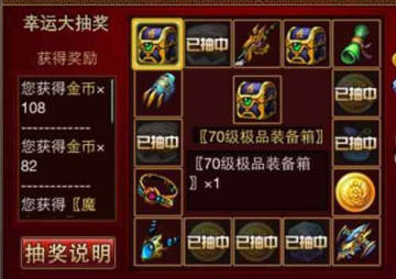 2、接着是抽奖传说装备,我们先要充值10元钱成为vip,可以金币交易, 然后创建6个小号一并练到25级,每个人物包里都少说有20多个金币,6个人物 都可以依次抽奖,每次抽奖都要花费20金币呢,先用1个角色来抽奖,第一次基 本都能抽中14金币的奖励,然后退出抽奖,领取14金币的奖励,然后在进行其 他角色的抽奖,6个叫角色抽奖下来,我们都有很大的几率抽到传说装备了,再 不济还有蛋糕魔晶,如果又中金币还能继续在抽奖呢!抽奖是比较靠人品,但 是你6个人物抽奖的概率很大爆传说装备。
