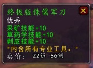 首先是升级版侏儒军刀,原料:15个弹簧齿轮。不再有专业限制,所有人可用,同时还增加10点挖矿,采药和剥皮技能。