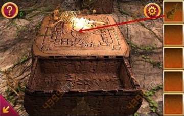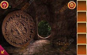 2、得到木棍后,点击图中箭头所指位置,可以看到三个人面石像,点击顺序为左右中,这时得到铁锹的头。