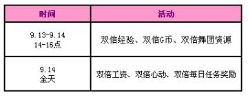 9.13-9.14每天14-16点开启双倍经验、双倍G币、双倍舞团资源活动。9.14全天将开启双倍工资、双倍心动、双倍每日任务奖励活动。